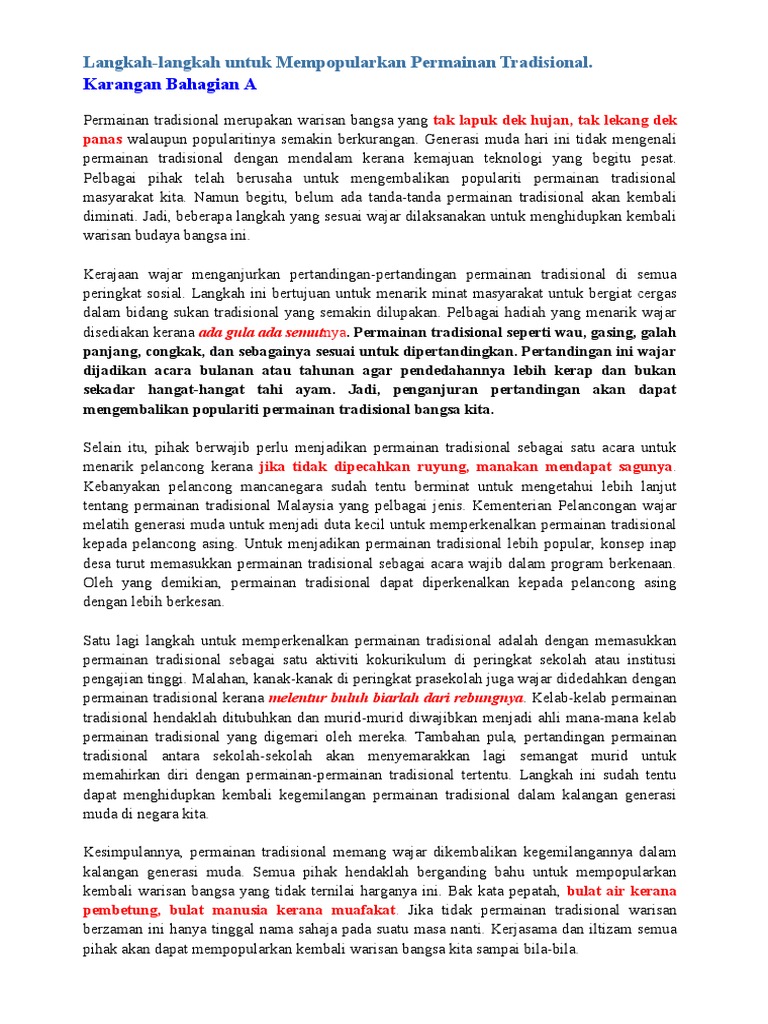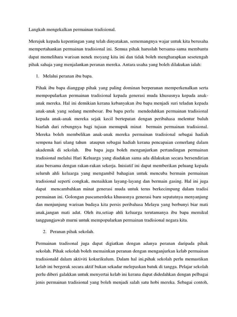 Karangan Bahagian A SPM Usaha Usaha Mempopularkan Permainan Tradisional Ibu bapa pula perlu memberi sokongan kepada anak-anak dengan cara membelikan peralatan permainan. Peranan Masyarakat Dalam Membentuk. Oleh hal yang demikian dengan adanya langkah proaktif tersebut kita dapat memastikan permainan tradisional mampu menjadi warisan budaya untuk generasi yang akan datang.
